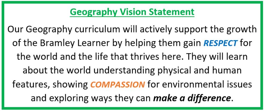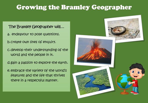 Mrs James says.. through their time at Bramley, I want the children to develop their understanding of the natural world and foster respect for the world and the life it sustains. Students will explore the Earth's physical and human features, understanding how different areas are similar and different to each other. I want the children to ask questions of what they see and experience, and pursue their own lines of enquiry to deepen their understanding. Our goal is for students to develop a passion for exploring the Earth and its diverse features - becoming thoughtful, curious and responsible global citizens.