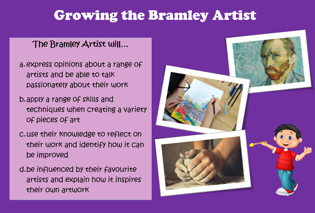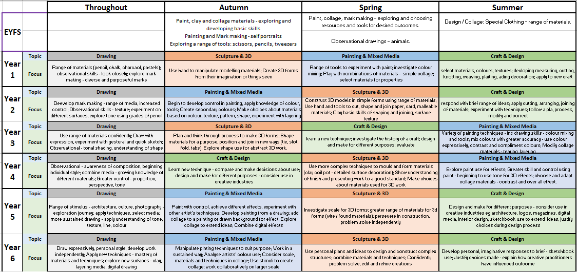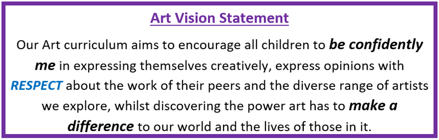 Miss Knight says... through our Art and Design curriculum, we want to provide our children with the opportunity to explore many different aspects of art and let their creatvity flow. Each year, they have the opportunity to learn about different artists and their techniques, before trying to develop their own skills and replicate their work. Our curriculum works progressively so that every time they return to a skill it is slightly more advanced or being applied in a different media. We have wroekd hard to develop exciting, engaging opportunities to apply their growing skills through themed topics, often linked to their main topic driver for that term.